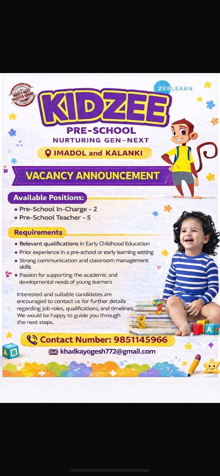 Vacancy Open in Kidzee Pre-school