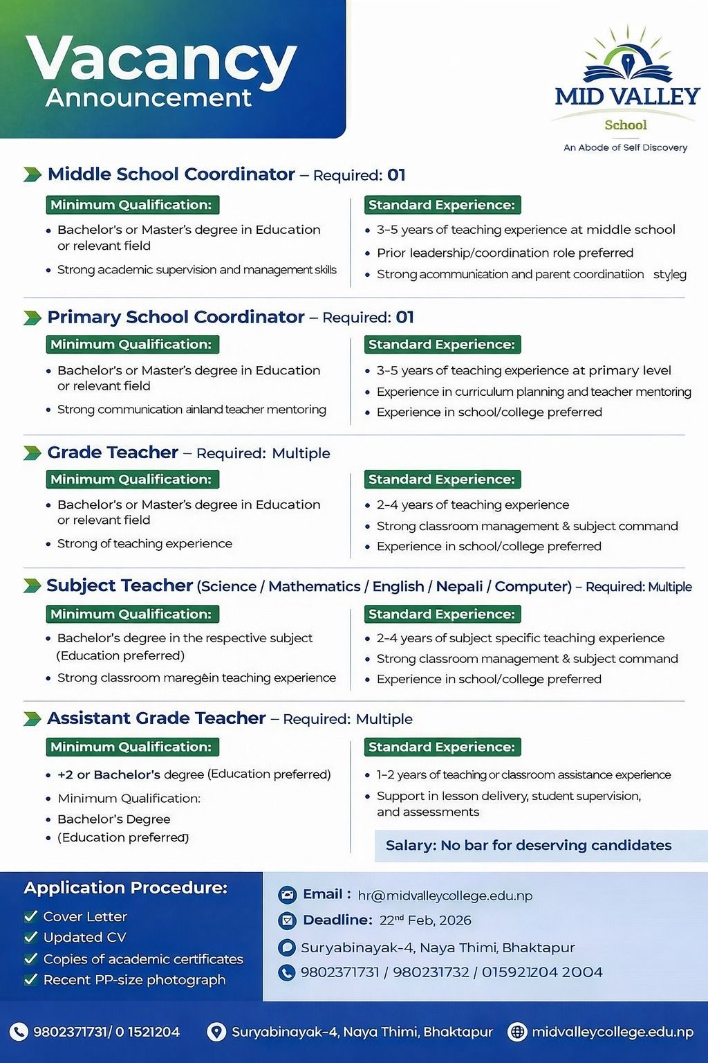 Vacancy Open in Mid Valley School, Suryabinayak, Bhaktapur