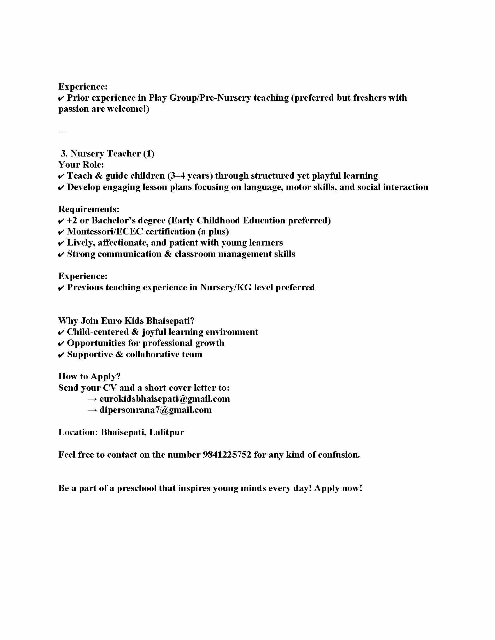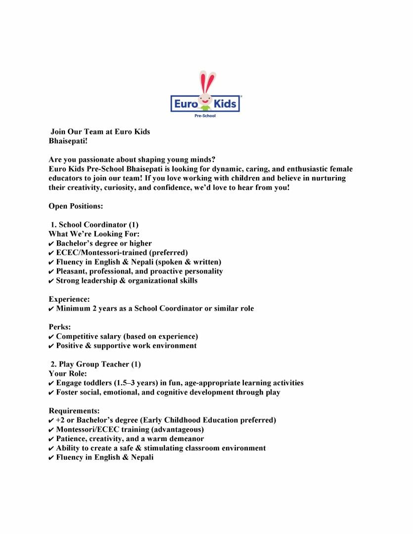 Vacancy Open in Euro Kids, Bhaisepati